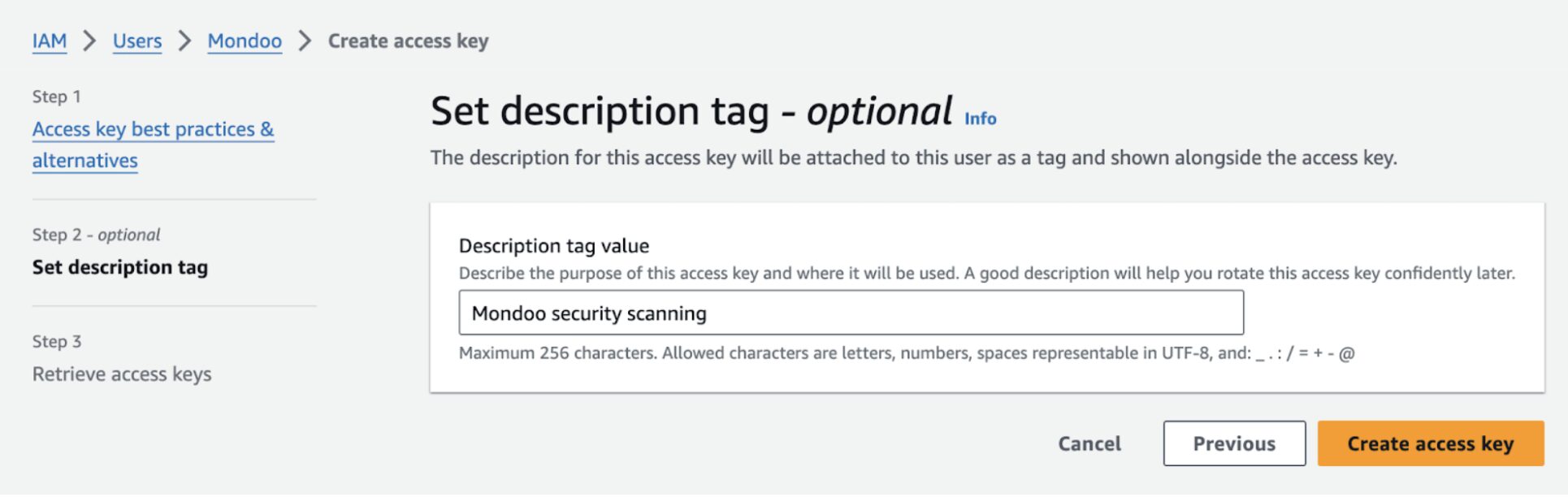 - Step A: Create an AWS user and access key for Mondoo