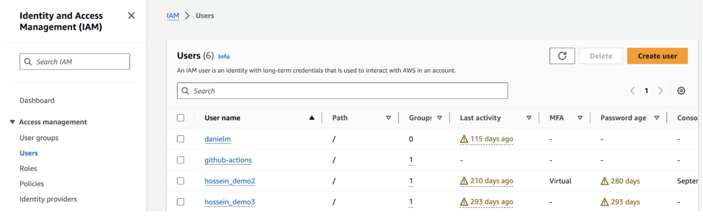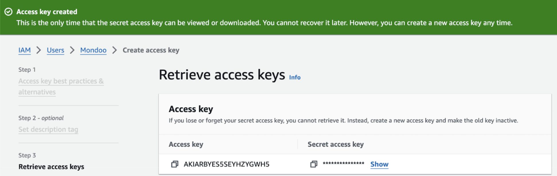 - Return to the AWS IAM tab in your browser. It shows the access keys you created in the steps above. Copy the Access key.