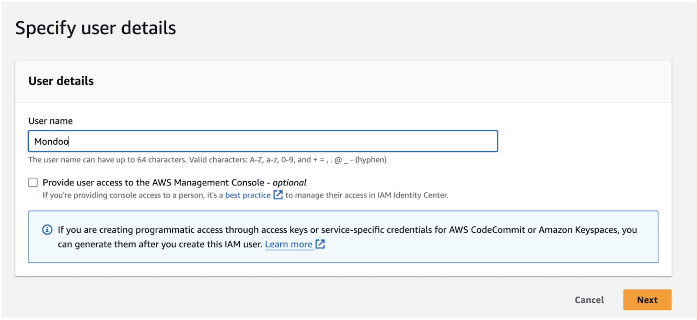 - Enter the user name Mondoo and select the Next button.