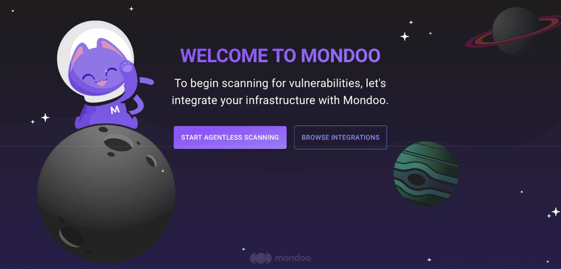 - After creating a new Mondoo account or creating a new space, the initial setup guide welcomes you. Select the BROWSE INTEGRATIONS button and then select AWS.