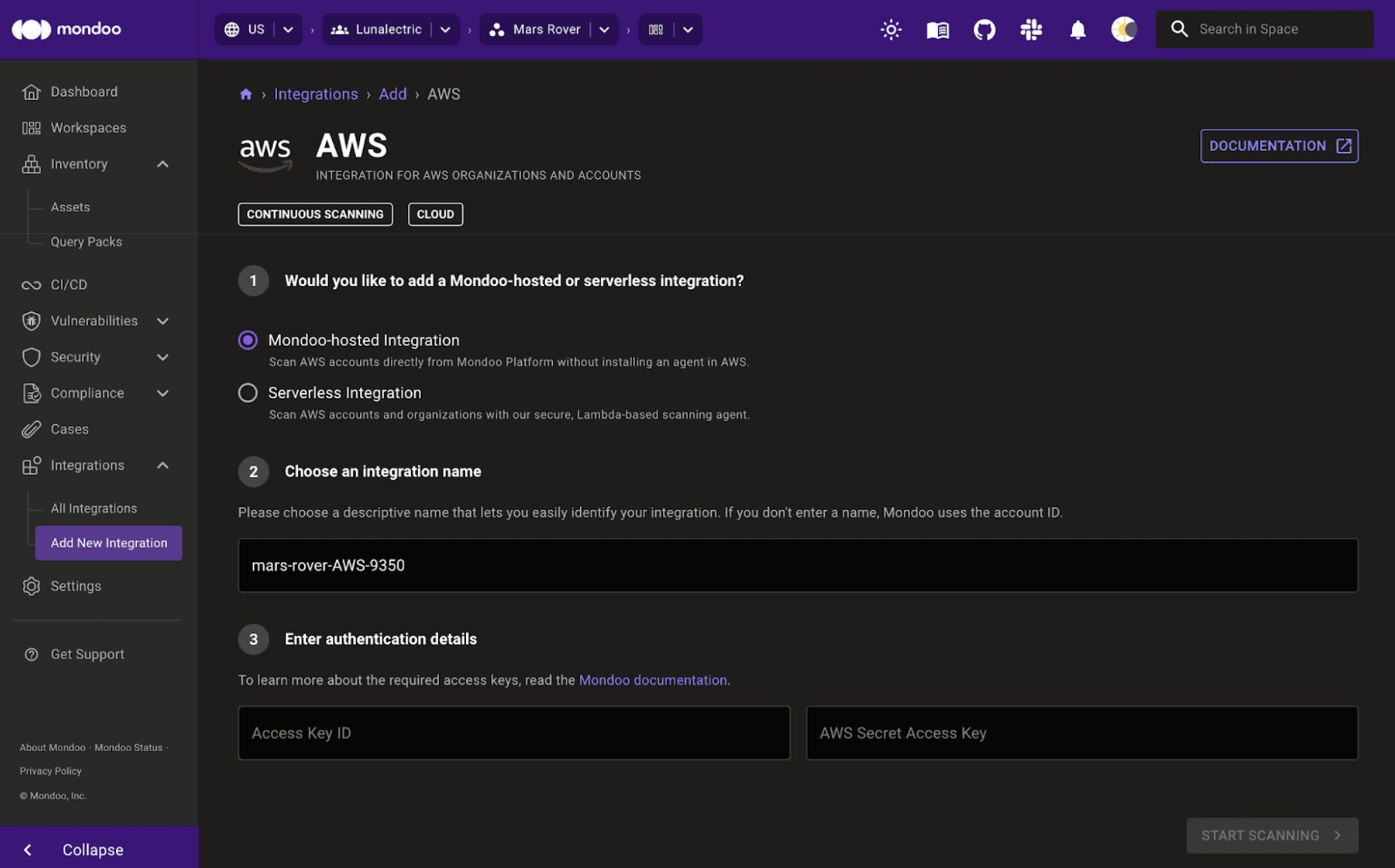 Choose between a Mondoo-hosted integration and a serverless integration: