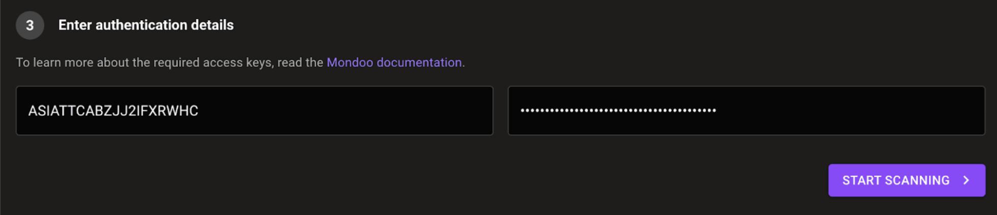 - In the Mondoo Console tab in your browser, in the second box under Enter authentication details, paste the AWS Secret access key.